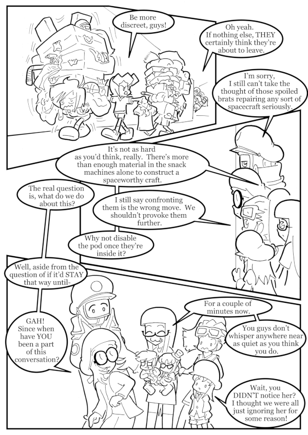 Uh oh. I’m having to resort to posting an unfinished draft to save time again. Sorry about this, gang. To provide some context, the version of the page you see before you is virtually unrecognizable from the original rough doodle I started with. At first, the format of this page was going to be a series of panels with silhouettes of the main characters talking to each other on the sides, and the gag was going to be the boys walking past the gap in the middle with comically larger piles of luggage in their arms. Then, in an entirely separate page later, Tabitha would be brought into the conversation to discuss what to do next. But then I thought “Wouldn’t it be funny if she was just already present in this page, and it wasn’t until the last panel that anyone noticed?” And suddenly the whole comic was entirely different. That’s the creative process for ya, baby! Of course, the big problem that that was, now, I had no rough draft of the page layout to work from, meaning I was putting this thing together entirely from scratch. And the problem with working without a net like that… well, ONE of the problems, is that it requires a whole lot more editing after the fact, and thus takes longer, and here we are.