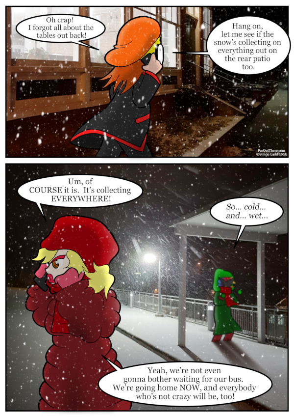 Chekhov’s disposal chute comes into play at last! And before you ask if it’d just make more sense for an underhanded criminal organization to just KILL a person snooping around… yeah, probably. But this is Far Out There, where all[…]↓ Read the rest of this entry…