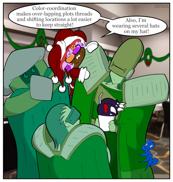I guess that technically qualifies as a spoiler, but only in the most general sense. But yeah, I’m deliberately setting up the upcoming story to have color-coded visual cues for distinct locations/groups in order to make quick cuts back and[…]↓ Read the rest of this entry…