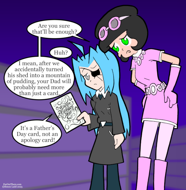 So, this is probably the most Christmas-y looking thing in this whole set of comics, and it wasn’t even on purpose. I just colored everything green because of COURSE I did, then stuck the red Far Out There stuff on[…]↓ Read the rest of this entry…