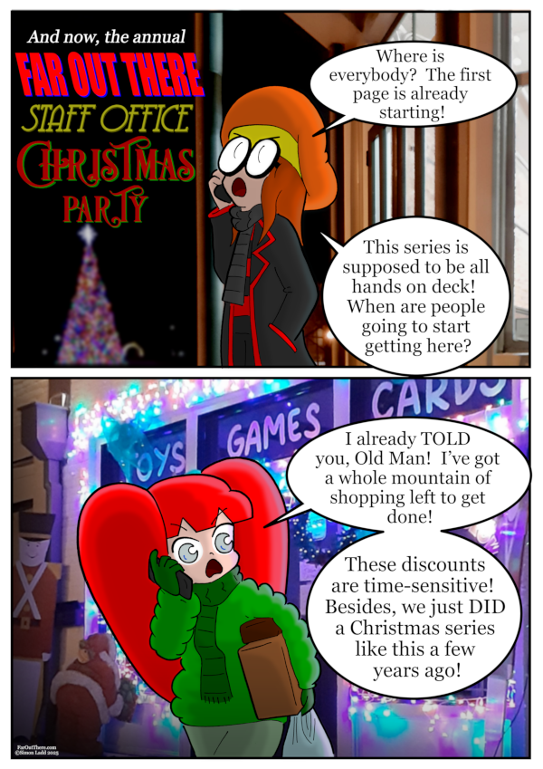 IT’S THAT TIME AGAIN, FOLKS! I’m taking the month of December to be SUPER self-indulgent and do a whole batch of comics outside the normal story! And I do mean “outside.” Just in case the dialog didn’t make it clear,[…]↓ Read the rest of this entry…